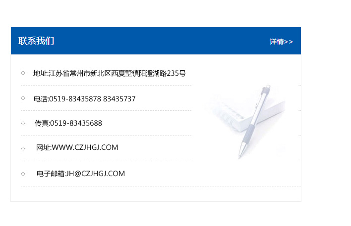 傳真:0519-83435688    郵編:213135    網址:WWW.czjhgj_com.sx-innuovo.com    電子郵箱:JH@czjhgj_com.sx-innuovo.com